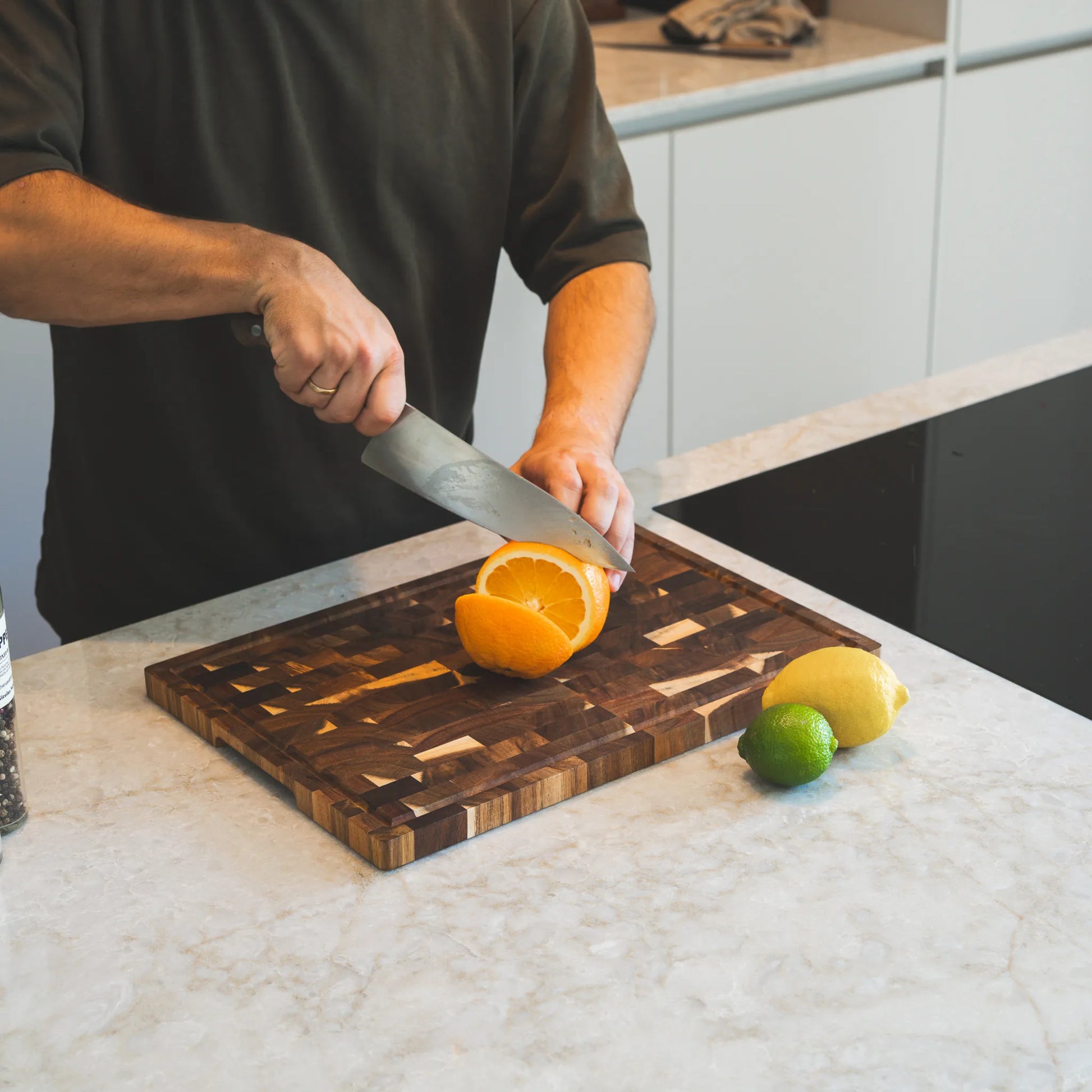 Deze plank biedt de perfecte balans tussen formaat en gebruiksgemak. Ruim genoeg voor het bereiden van vlees of groenten, maar licht genoeg om makkelijk te tillen of op te bergen. Dankzij het kopshout blijft de plank jarenlang mooi en je messen vlijmscherp.