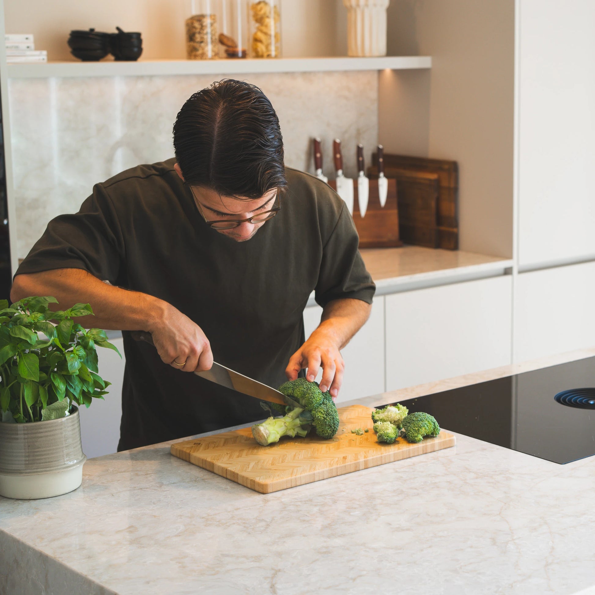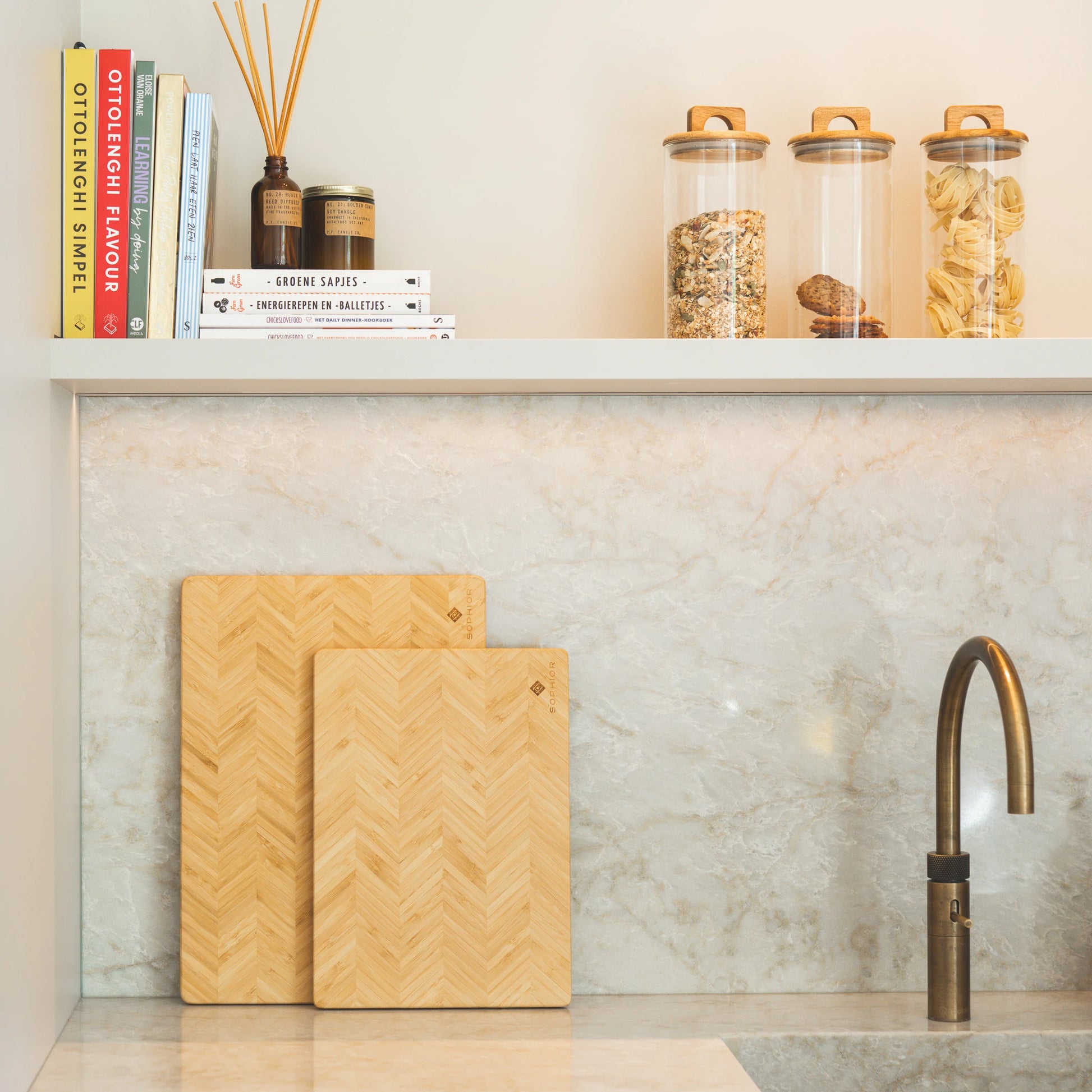 De compacte plank gebruik je voor snelle bereidingen, de grotere voor meer werkruimte. Dankzij het visgraatdesign zijn de planken niet alleen praktisch, maar ook echte blikvangers op tafel.