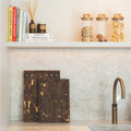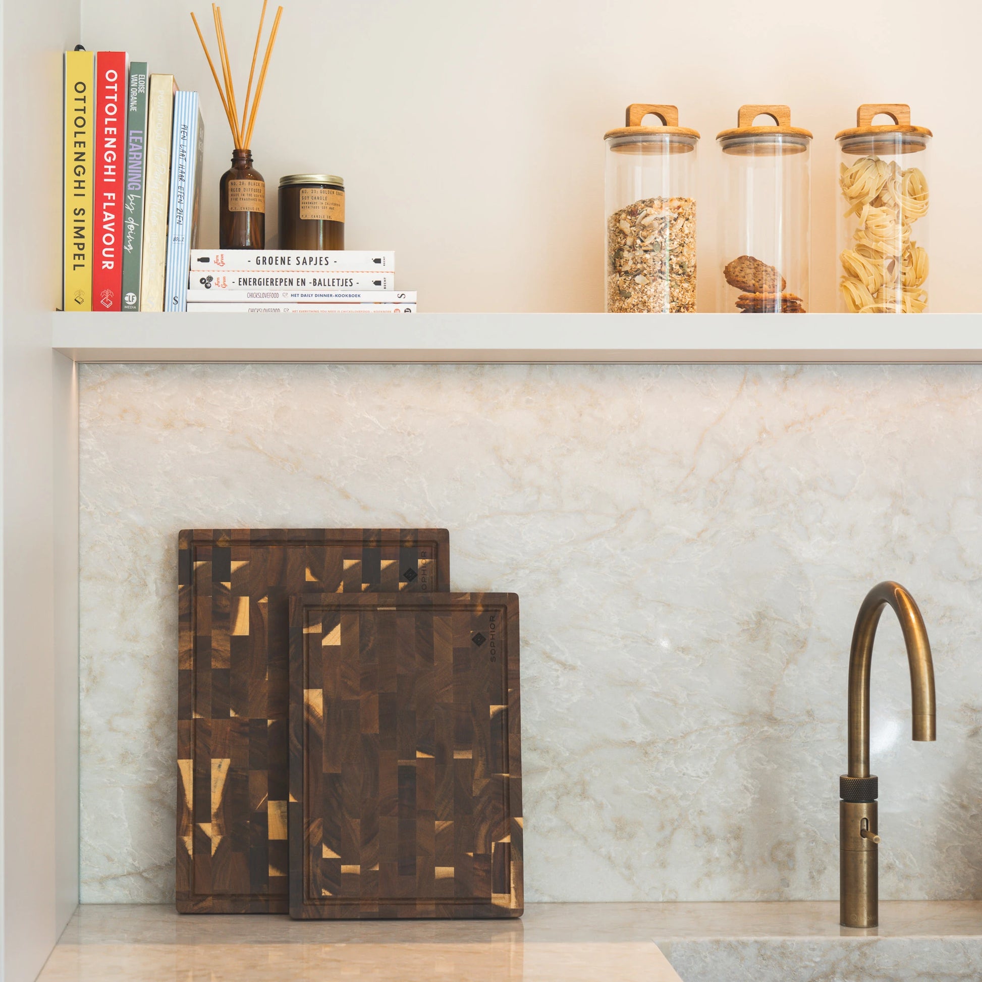 Plastic snijplanken laten microplastics achter in je eten en glas of titanium snijplanken maken je messen bot. Deze set van twee acacia houten snijplanken is gemaakt van kopshout (end-grain), wat de planken extra sterk maakt en je messen optimaal beschermt.