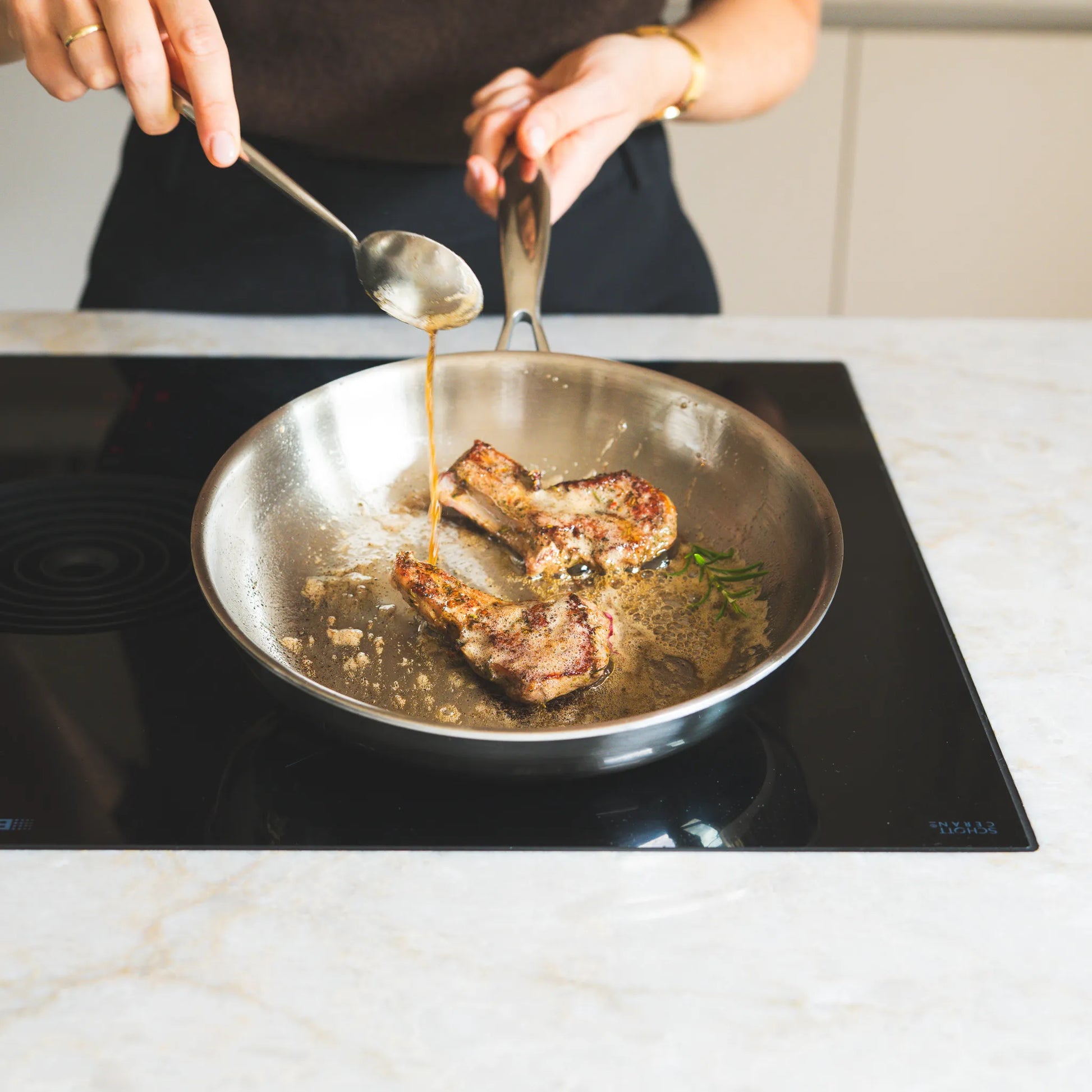 Laat de pan eerst goed warm worden (nooit maximaal, bijvoorbeeld 6 op een schaal van 1 tot 9 inductie) voordat je olie of boter toevoegt. Leg daarna het eten pas in de pan. Dit voorkomt plakken en zorgt voor een perfecte korst. RVS pannen vereisen iets meer techniek dan bijvoorbeeld Hybride Koekenpannen, maar leveren fantastische bakresultaten zodra je eraan gewend bent.