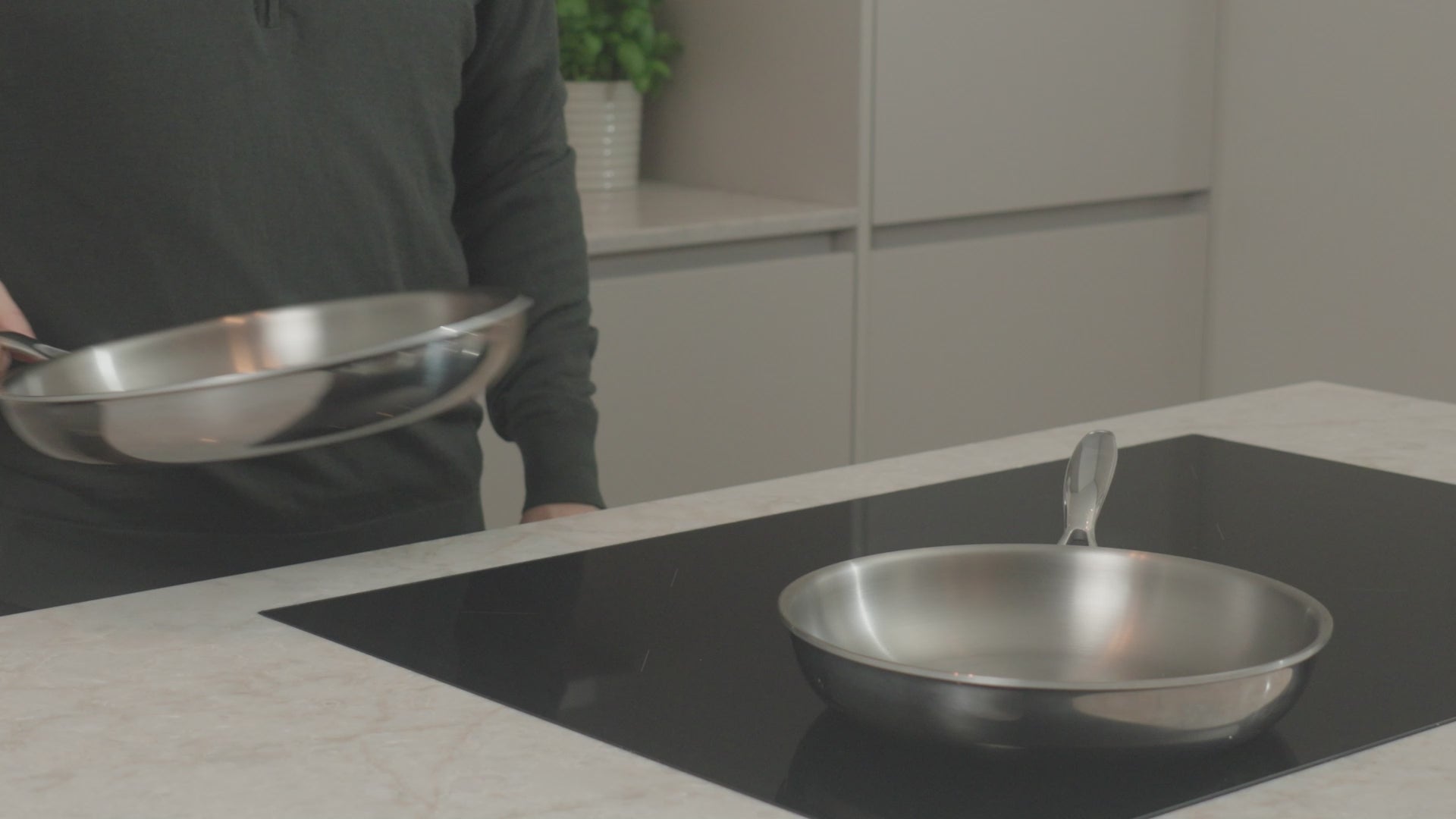 Laat de pan eerst goed warm worden (nooit maximaal, bijvoorbeeld 6 op een schaal van 1 tot 9 inductie) voordat je olie of boter toevoegt. Leg daarna het eten pas in de pan. Dit voorkomt plakken en zorgt voor een perfecte korst. RVS pannen vereisen iets meer techniek dan bijvoorbeeld Hybride Koekenpannen, maar leveren fantastische bakresultaten zodra je eraan gewend bent.