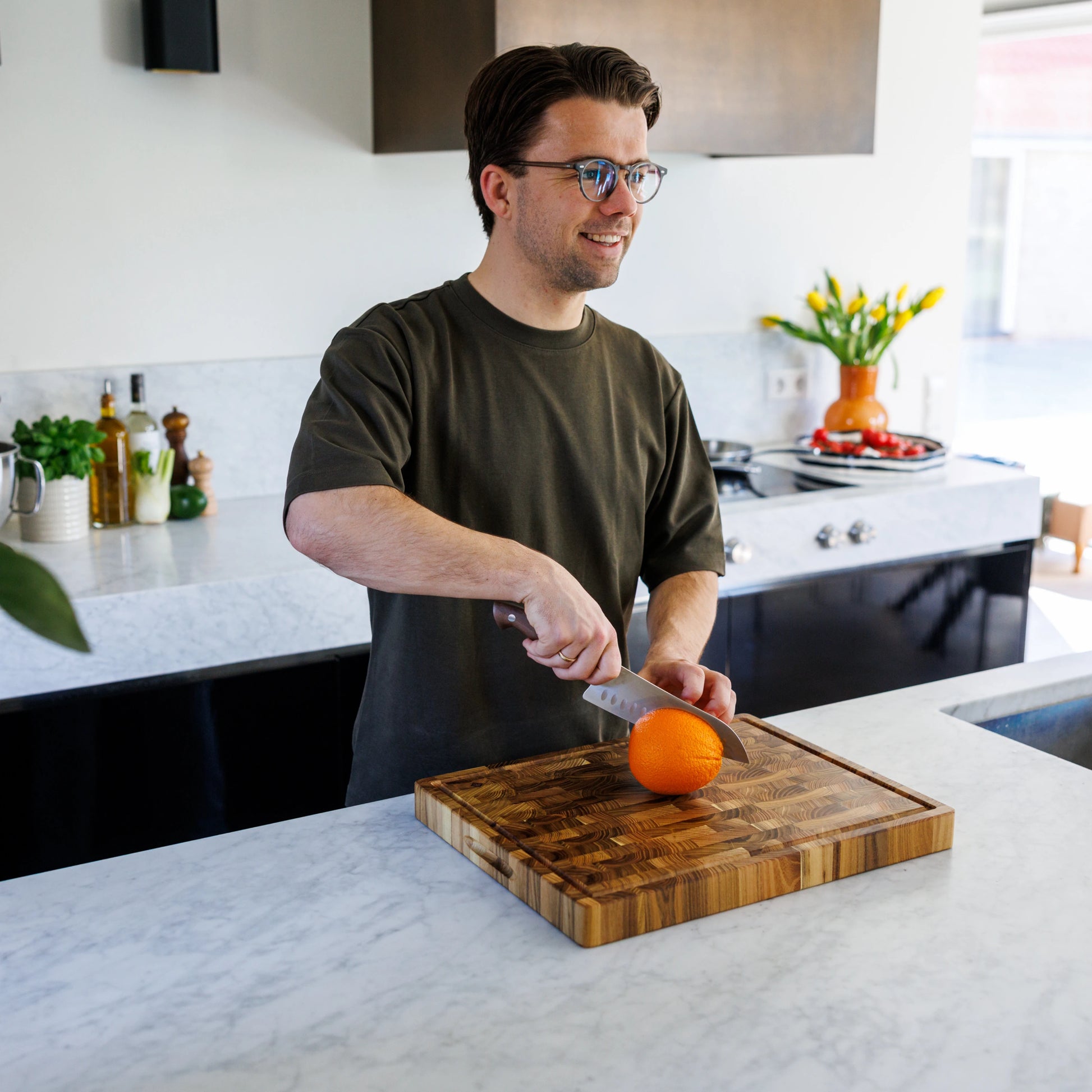 De kopshout constructie versterkt die duurzaamheid verder. De houtvezels staan verticaal in de plank, waardoor het mes bij het snijden tussen de vezels glijdt in plaats van erdoorheen. Dat zelfherstellende effect zorgt voor minder zichtbare snijsporen en een langere levensduur van zowel de plank als je messen. Op 4 cm dikte en 45×35 cm oppervlak is dit een robuuste plank die ook stevig genoeg is voor intensief dagelijks gebruik, het versnijden van een kippenpoot of het hakken van groenten voor een stoofpot.